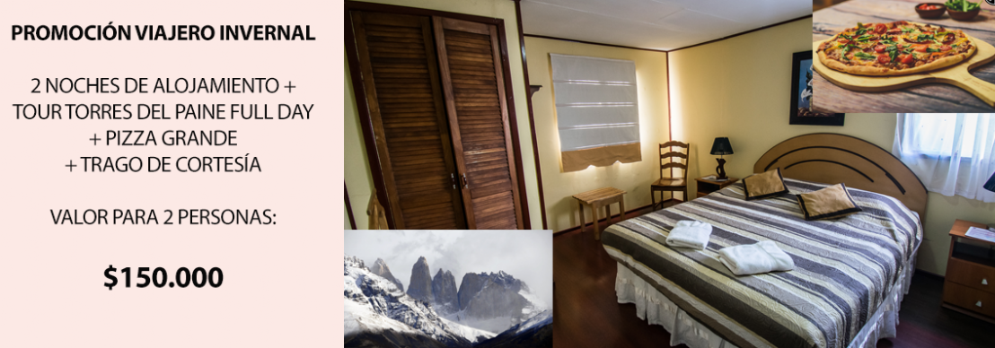 El plan incluye 2 noches de Alojamiento en habitación privada con desayuno diario + Tour Full Day Torres del Payne + Pizza grande y Trago de cortesía